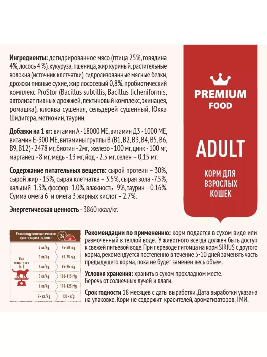 SIRIUS Мясной рацион для взрослых кошек 10кг купить, цена в интернет-магазине "Багира" Симферополь, Крым - БАГИРА зоомагазин в Крыму