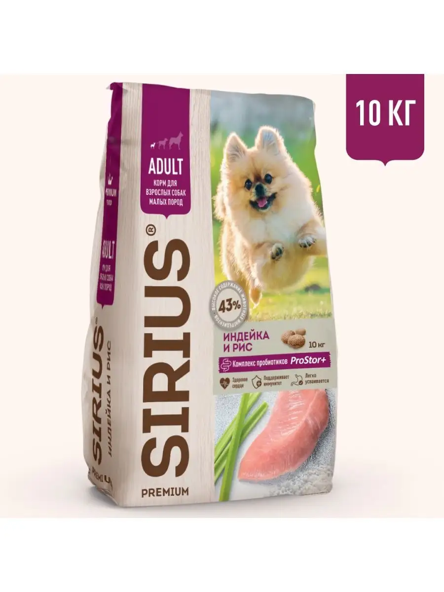 SIRIUS для взрослых собак мелких пород с индейкой, рисом 10 кг