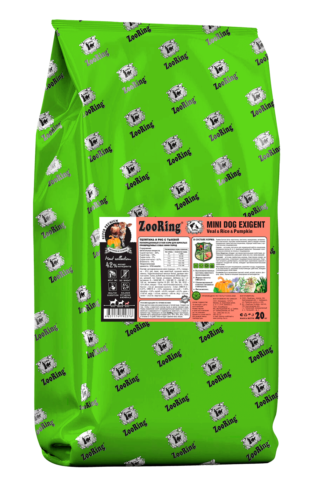 ZooRing Mini Dog Exigent Телятина, рис, тыква для привередливых собак мини пород 20кг