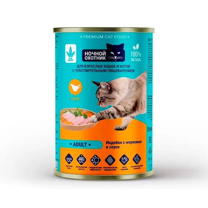 Ночной Охотник Индейкаи и морковь в соусе при чувствительном пищеварении у кошек 415г