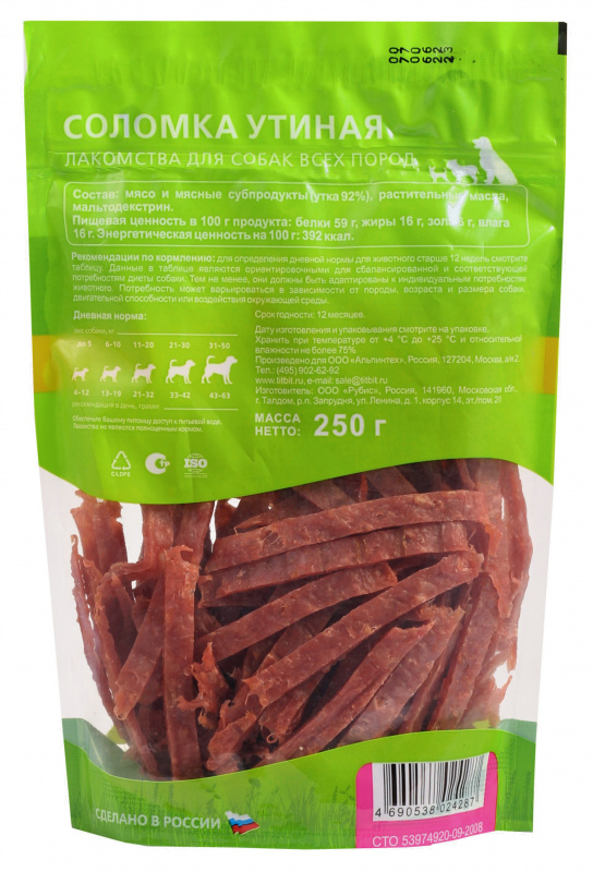 Соломка утиная - это аппетитное угощение для собак всех пород. Благодаря высокому содержанию мяса (92%) и бережной технологии приготовления, имеет привлекательный внешний вид и вкус. Мясо и мясные субпродукты, входящие в основу соломки, являются превосходным источником высококачественного животного белка, витаминов и минералов. Выгодная XXL упаковка с удобным замком zip-lock сохранит лакомство и продлит удовольствие Вашего любимца.